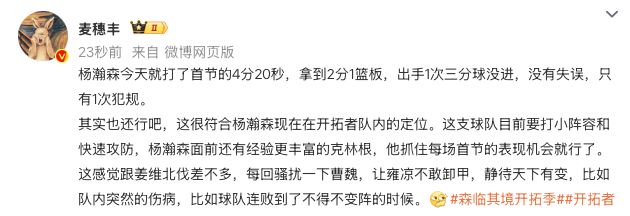 媒体人:开拓者目前要打小阵容,杨瀚森抓住首节的机会就行了