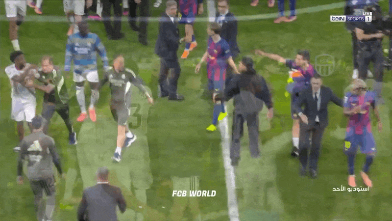 在第100分钟,裁判哨响,皇马以2-1在伯纳乌带走了3分,也结束了比赛的悬念。但国家德比的战斗不会在哨响后结束。